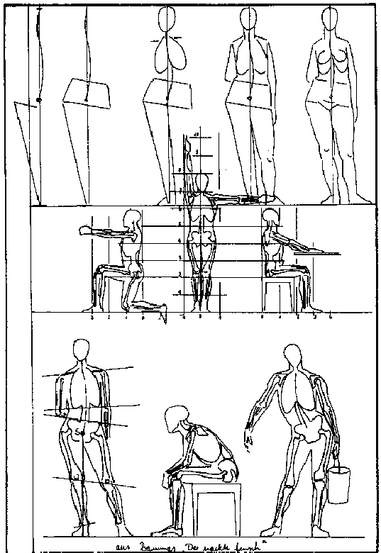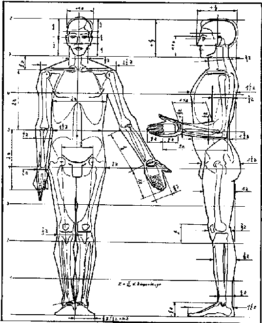 Die 1/8 Teilung der Körperhöhe zur Festlegung der wichtigsten Punkte: Scheitel; Kinnspitze-; Brust; Taille; Körpermitte; Unterkante Kniescheibe ist so bekannt, daß es hier nicht notwendig erscheint weitere Erläuterungen anzuschließen.
